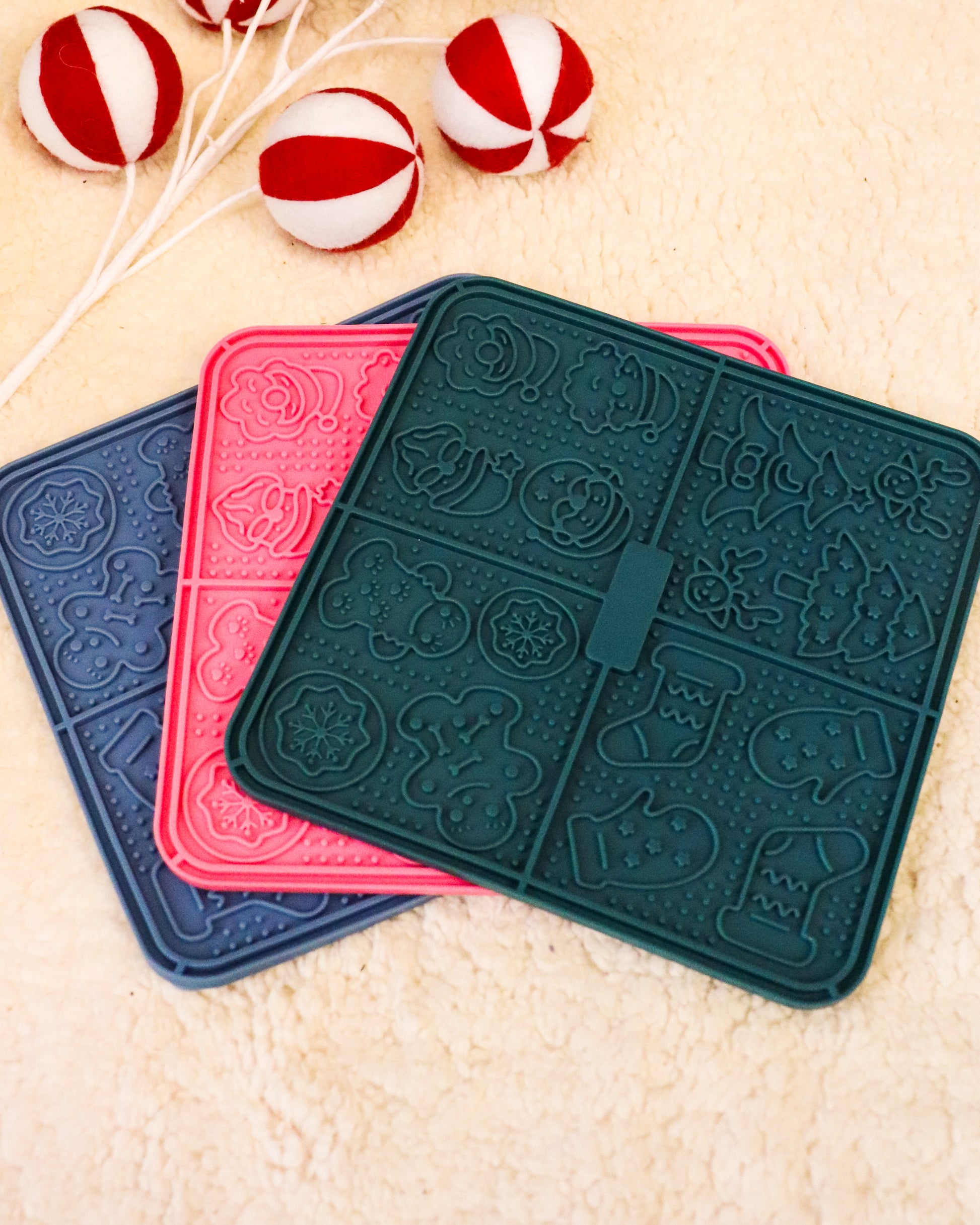 The festive lickmat is a larger size at 20x20cm and comes in 3 gorgeous colors Green , Pink & Blue and feature suction cups on the reverse so can also be used in the bath