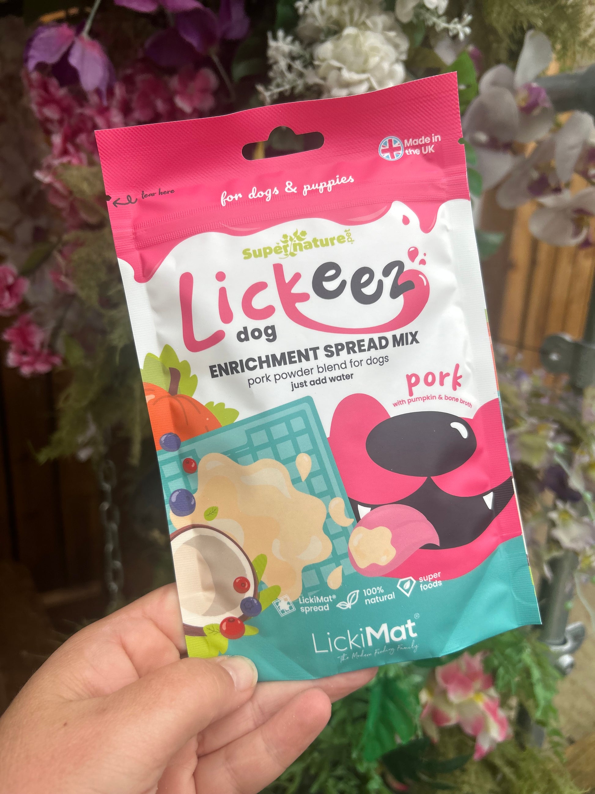 Tasty beef or pork & superfood enrichment spread mix for dogs, just add water to make a delicious spread for licking mats and other toy feeders.