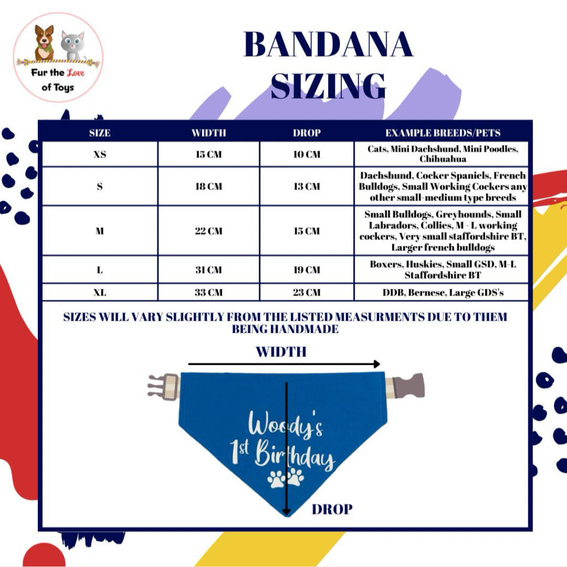 NOTE: our bandanas fit over an existing collar your pet wears, they do not tie around your pet's neck on their own - please bear this in mind when choosing a size as they aren't designed to be the same size of your pet's full neck circumference.